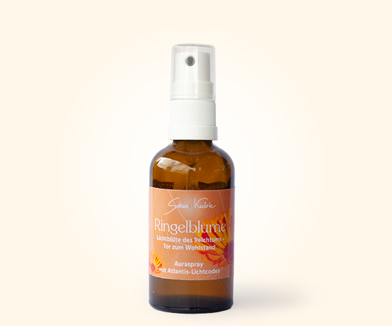 Spirituelles Auraspray. Goldene Ringelblume vereint mit atlantischen Lichtcodes für Reichtum, Fülle und Wohlstand auf allen Ebenen. Öffnet Herz und Energiefeld für den natürlichen Fluss von Geben und Empfangen.